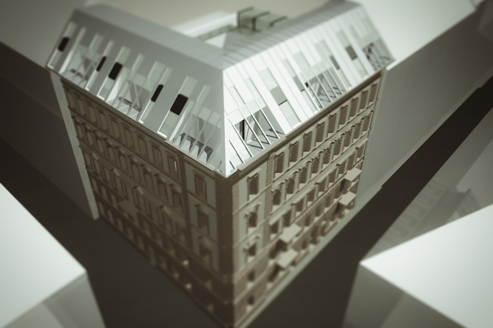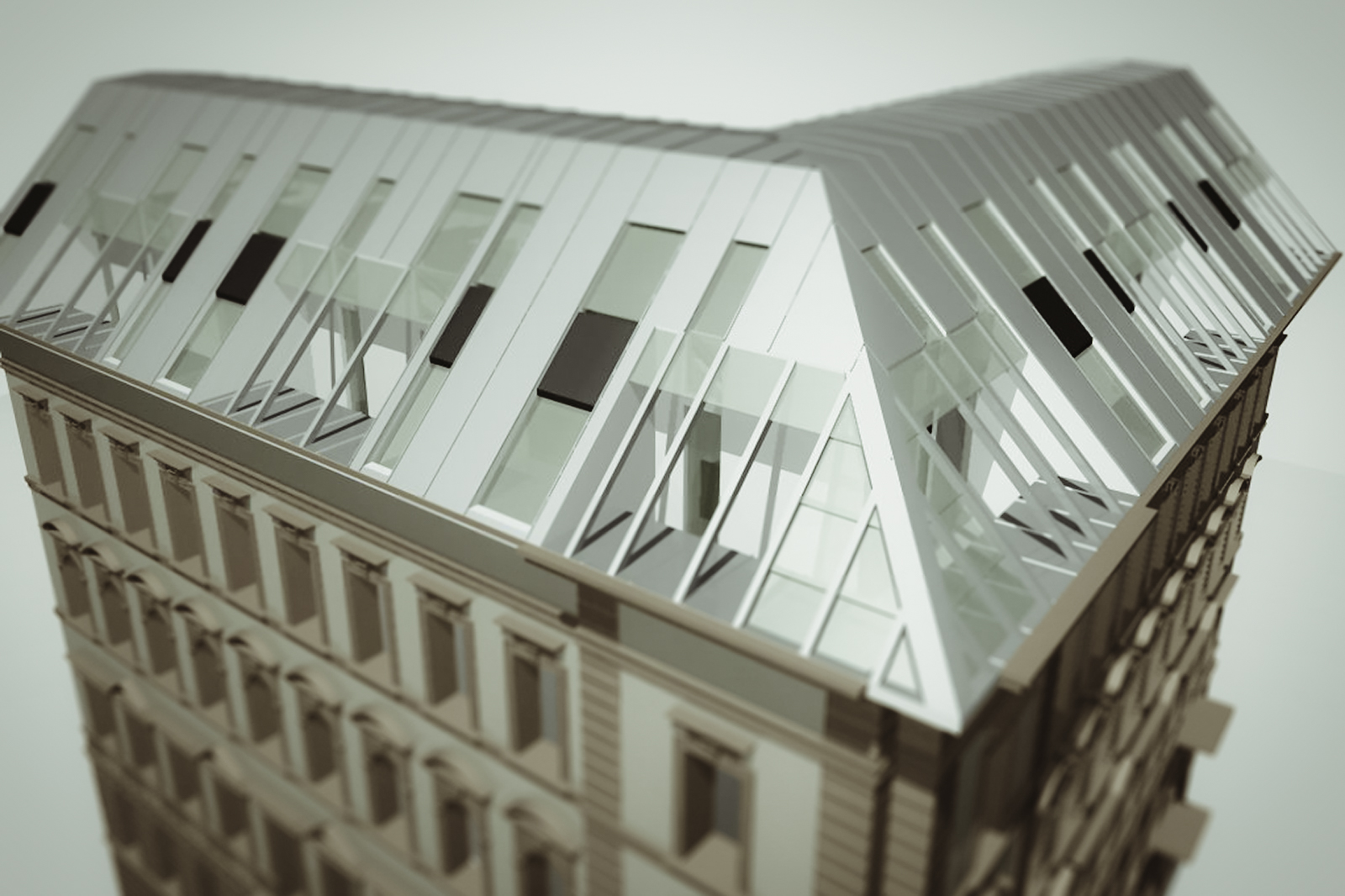 Our office planned an extension of an existing building in the Izabella Street in Budapest. The building was to be expanded in L-shaped with two additional floors plus atticon the street front, furthermore with two additional floors and green roof on the side of the inner courtyard. The mass of the edifice adapted completely to the neighbouring buildings, the size of the building was based on the high of the neighbours and firewalls. We aimed to design several different structures of the interior according to needs: frombed-sitter to 3-room apartment.