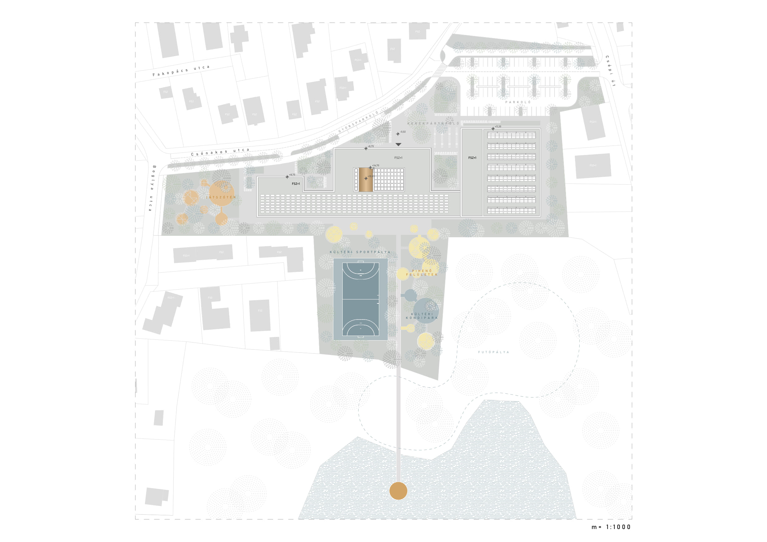 - Lehetőség szerint aktív módon kacsoljuk össze a Bucka tó parkos felületét az újonnan létrehozandó sport és játszóudvari területekkel.