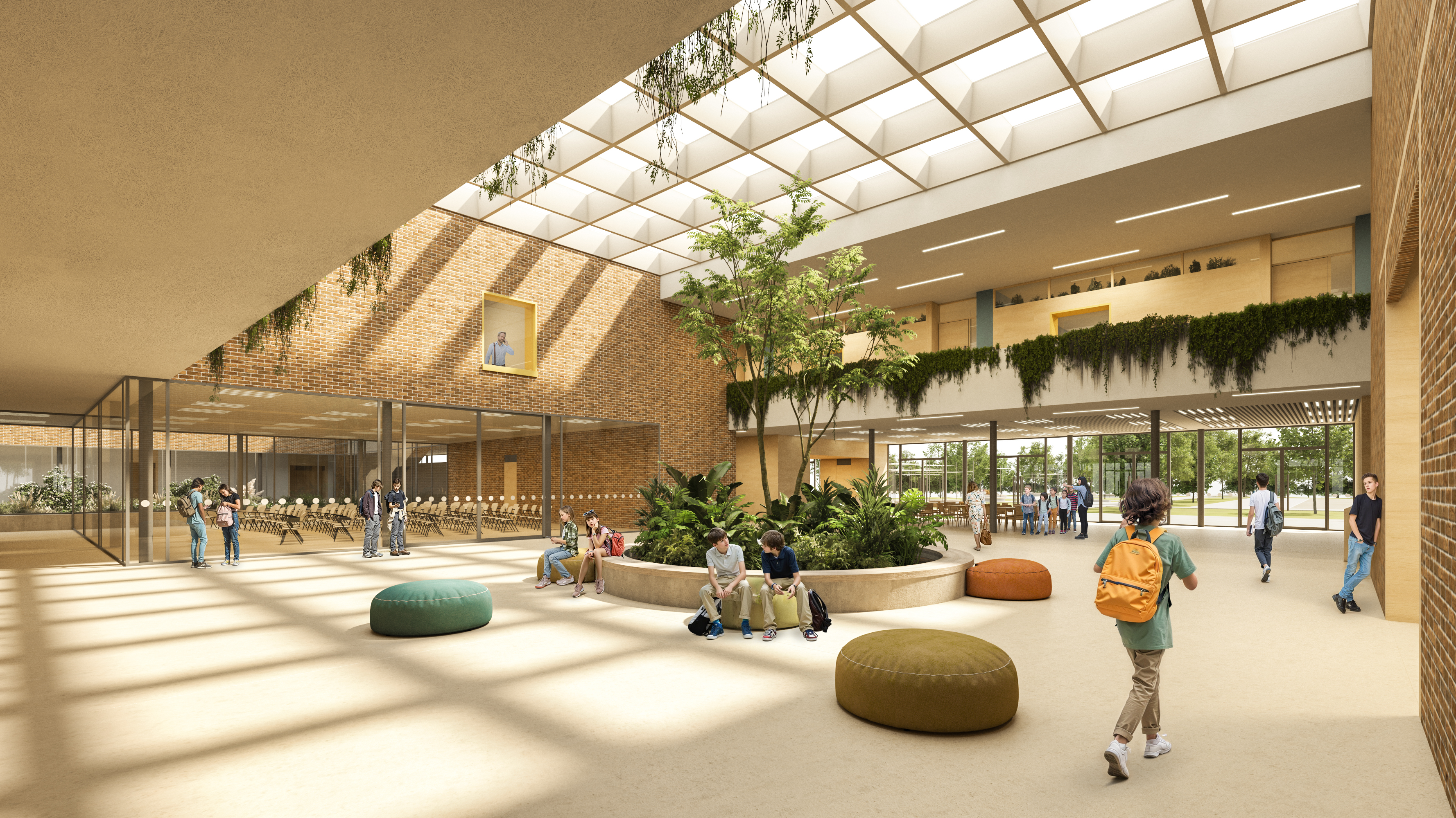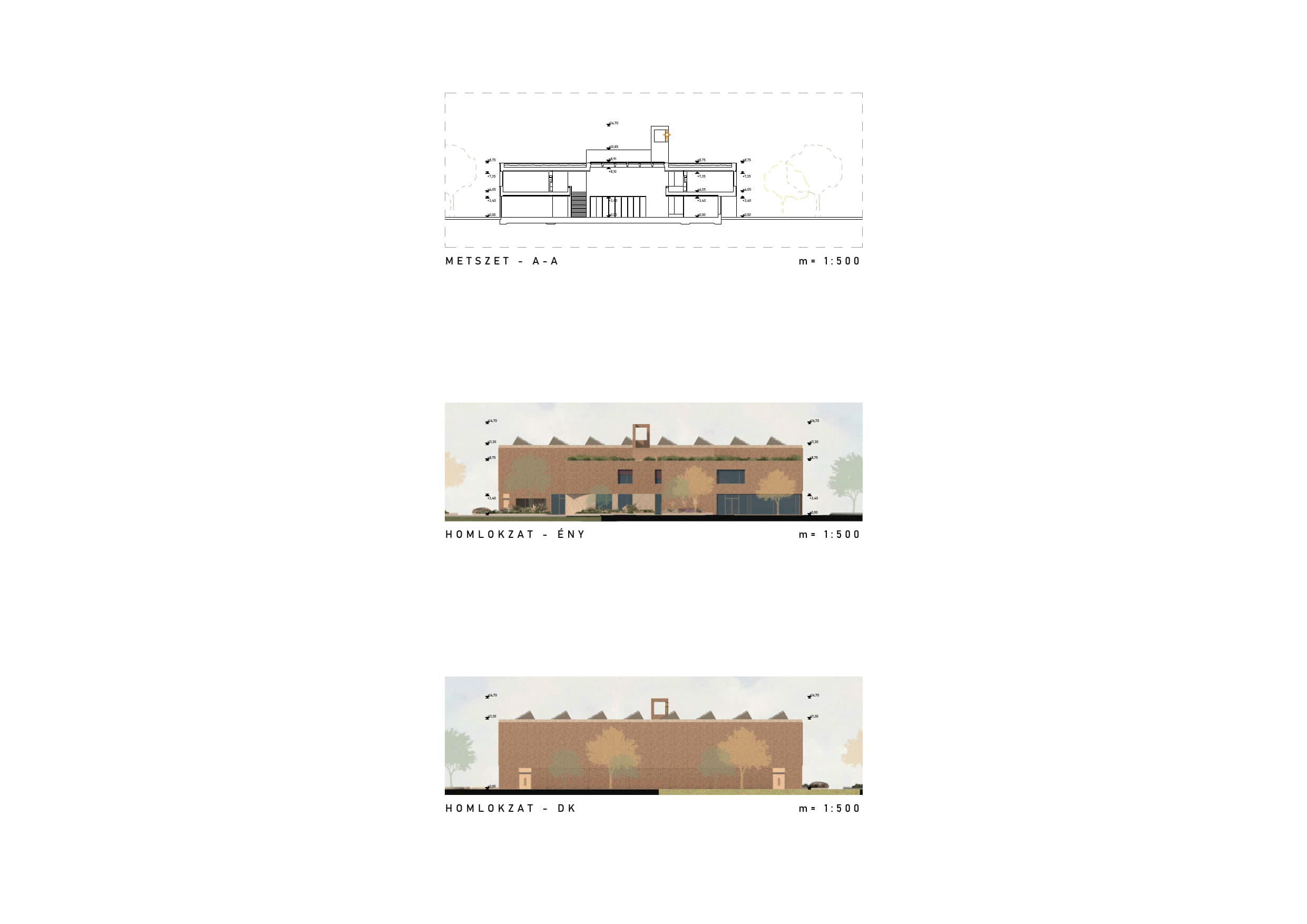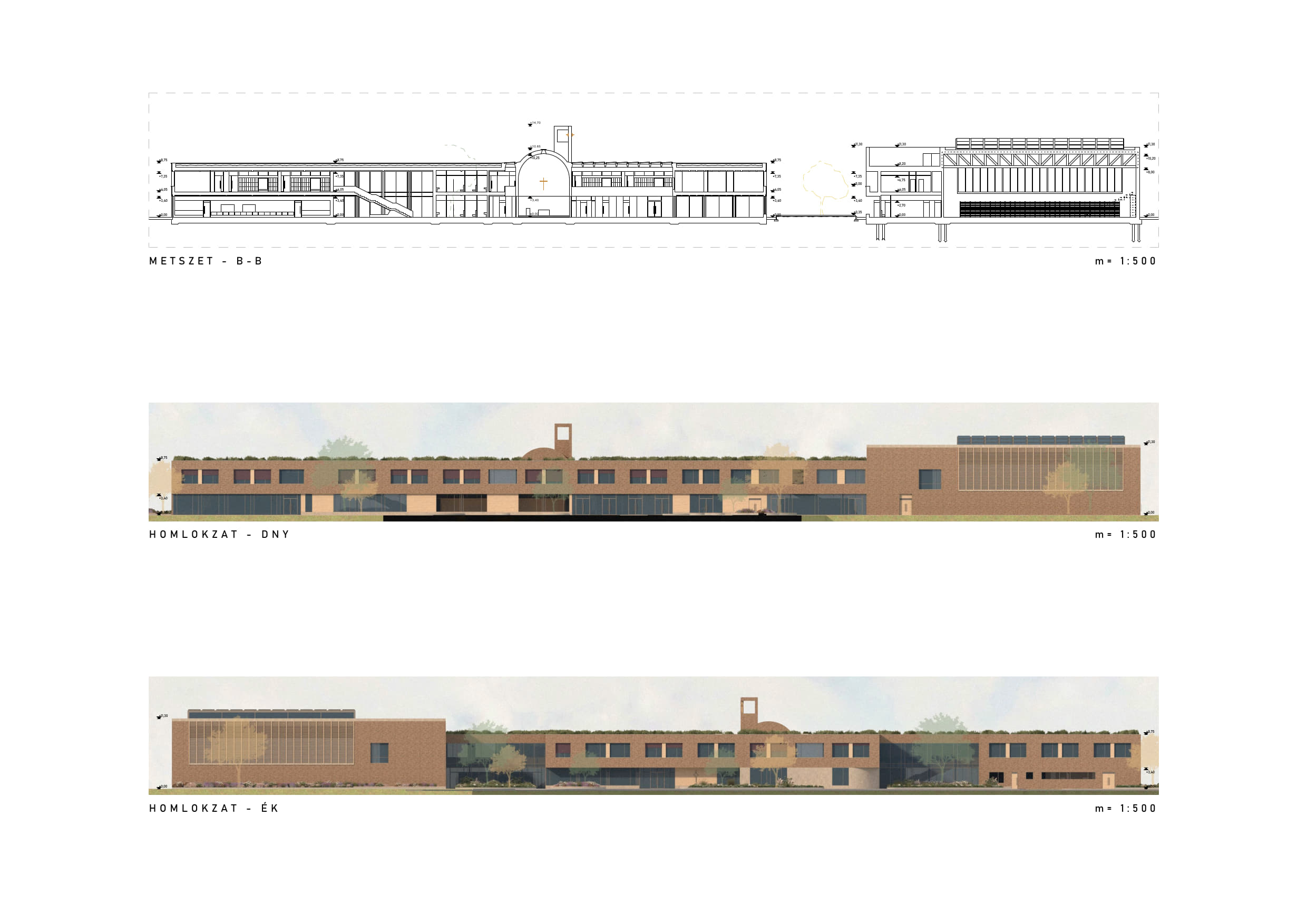 A nagyobb alapterületű funkciók telepítési lehetőségeit és a felsorolt célokat egyaránt figyelembe véve az épületet a T telekforma szárainak összemetsződésébe pozícionáltuk, térfalként az utcai közhasználatú, és az iskola oktatási időszakában kizárólag a diákok számára fenntartott külső telekrészek/udvarok között. Az így létrejövő térfal tömegrészeit széthúztuk, közterületi térbővületeket képeztünk. A kompakt tömeget nagyméretű földszinti homlokzati lyukasztásokkal, a külső térrészek közötti átlátásokkal, valamint a Csónak utca görbületét lekövető, mélységében változó térfal pozíciókkal oldottunk fel.