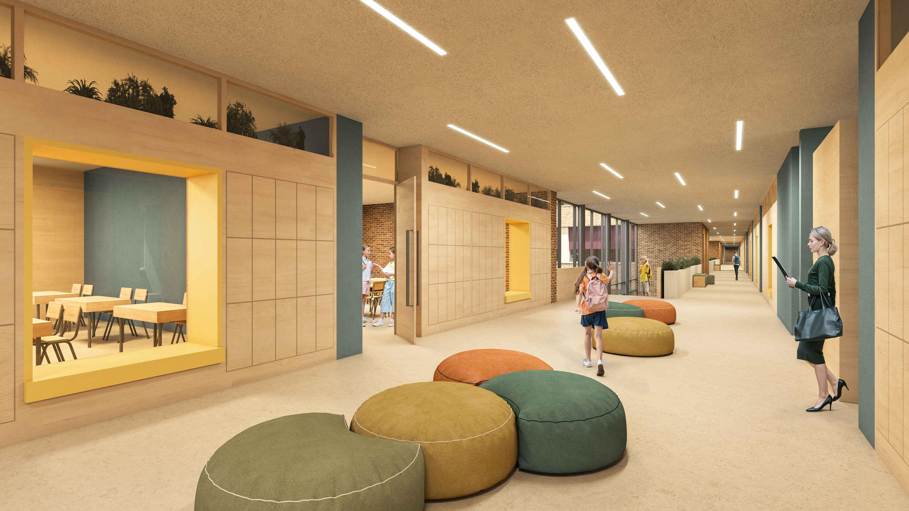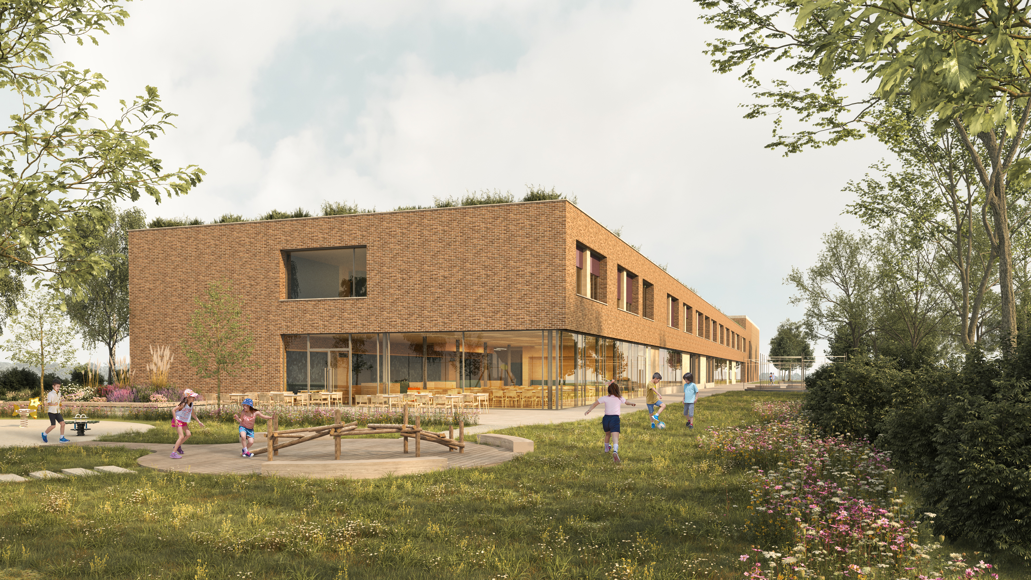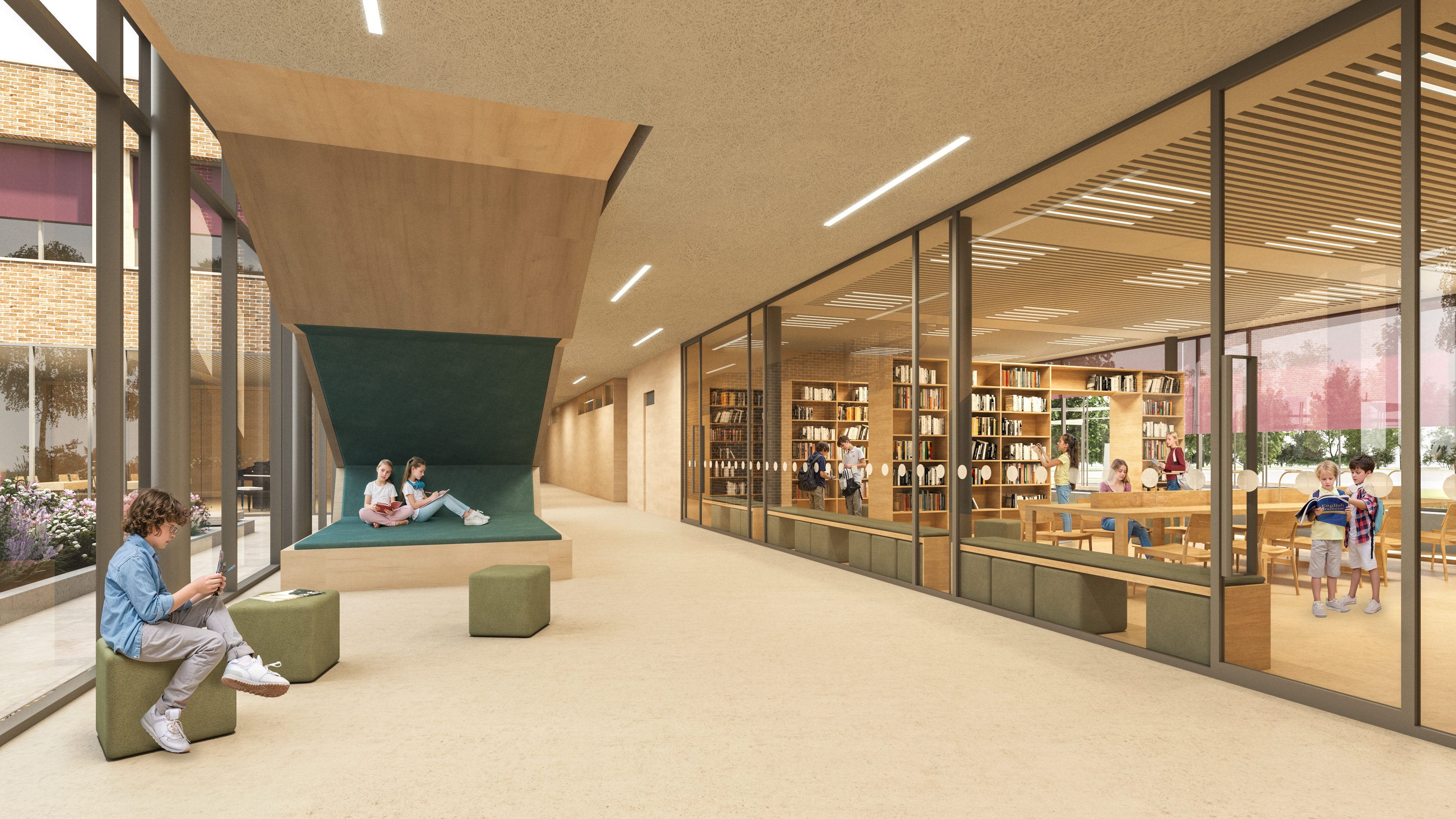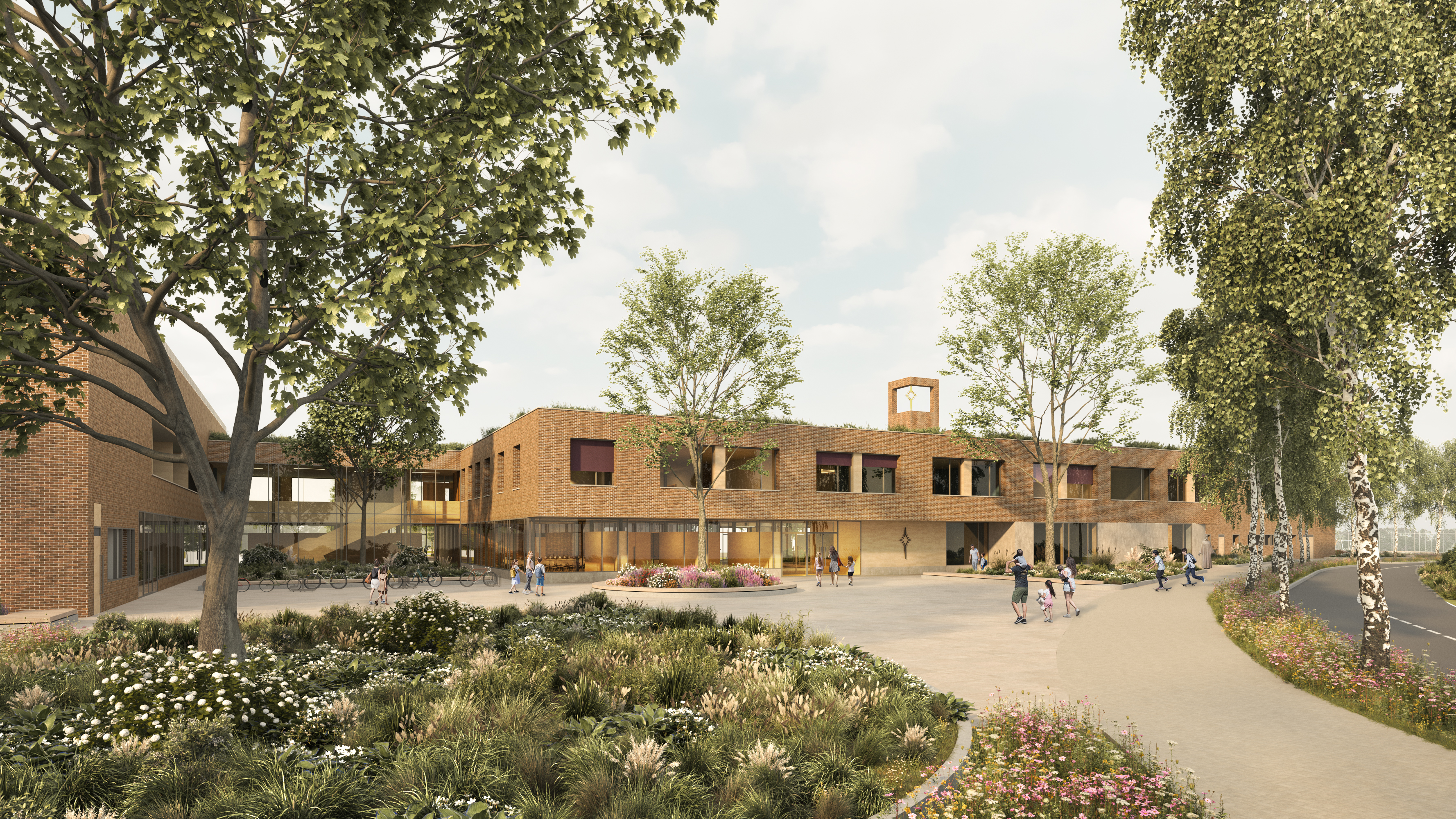 A nagyobb alapterületű funkciók telepítési lehetőségeit és a felsorolt célokat egyaránt figyelembe véve az épületet a T telekforma szárainak összemetsződésébe pozícionáltuk, térfalként az utcai közhasználatú, és az iskola oktatási időszakában kizárólag a diákok számára fenntartott külső telekrészek/udvarok között. Az így létrejövő térfal tömegrészeit széthúztuk, közterületi térbővületeket képeztünk. A kompakt tömeget nagyméretű földszinti homlokzati lyukasztásokkal, a külső térrészek közötti átlátásokkal, valamint a Csónak utca görbületét lekövető, mélységében változó térfal pozíciókkal oldottunk fel.